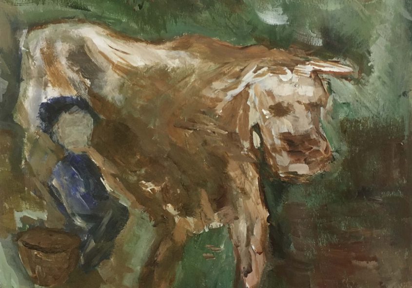 Gerrit | Boer melkt koe | Acrylverf op papier