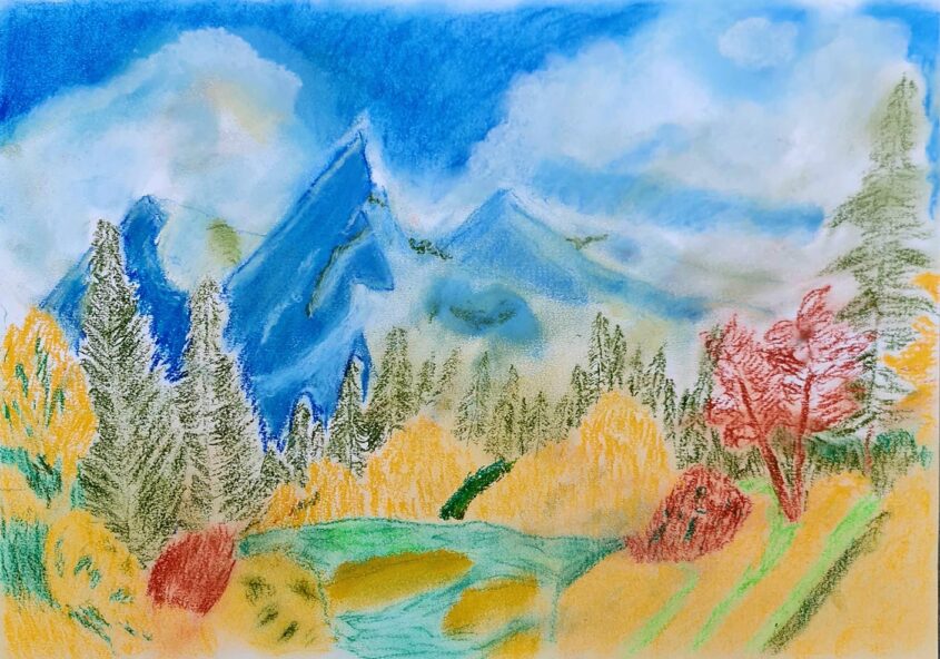 Rinus | Landschap a la Bob Ross | Pastelkrijt op papier