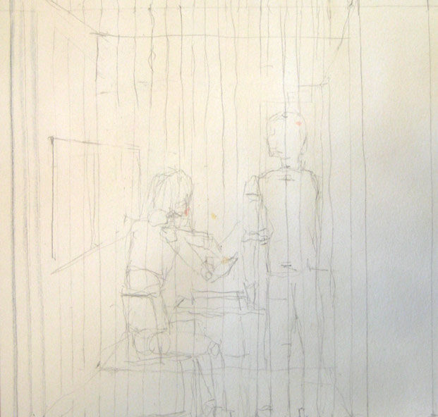 Kees | Huiselijk tafereel bezien door lamellen | Potlood op papier