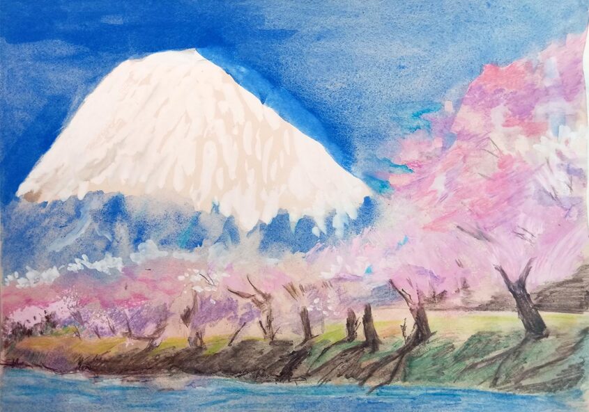 Corrie | Japanse berg | Nat-in-nattechniek met aquarelverf en daarna aquarelpotloden op papier