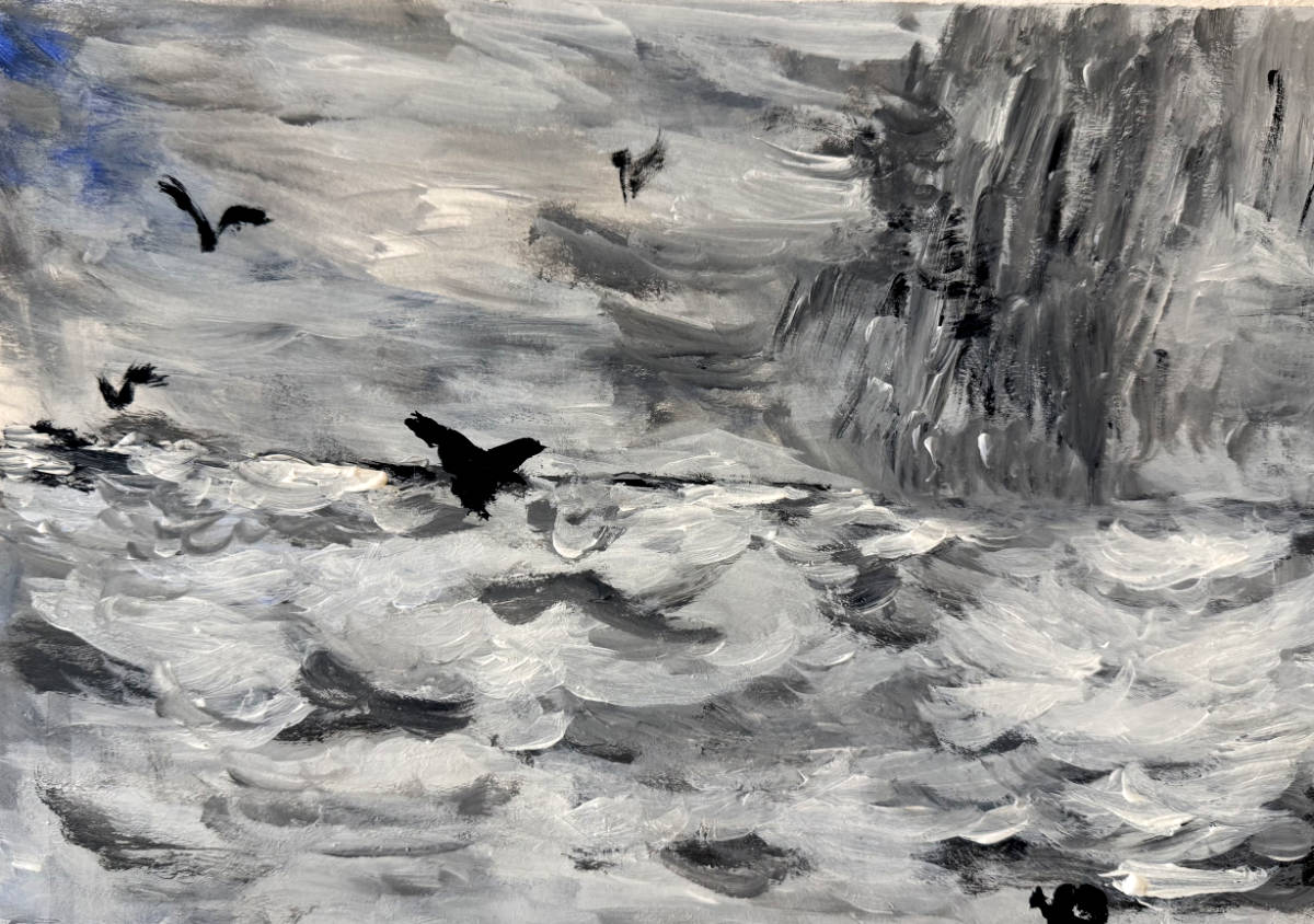 Gerrit | Regenbui op Zee | Acrylverf op papier Bekijk meer werk van Gerrit Atelier Amsterdam Gerrit regenbui Zee
