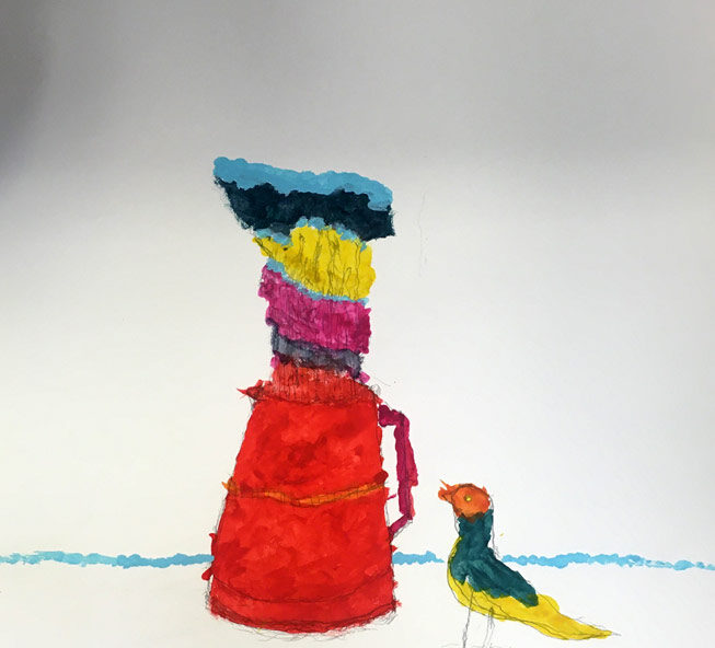 Gerard Jos | Vogeltje met een pot | Acrylverf op papier
