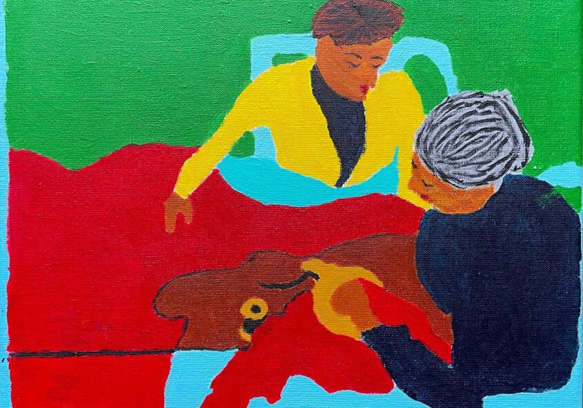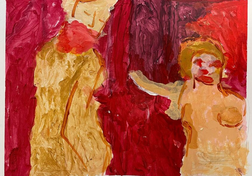 Wil | Twee dames voor rood gordijn | Acrylverf op papier