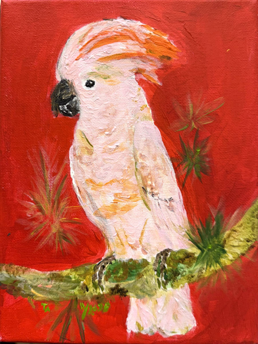 Threes | Molukkenkaketoe | Acrylverf op doek Bekijk meer werk van Threes Atelier Amsterdam Molukkenkaketoe Threes Vogels