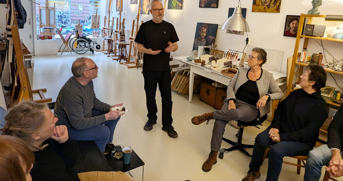 Kunstenaar Bas Vries had een verrassing voor de deelnemers van de dinsdagochtend groep in het Marline Fritzius atelier in Amsterdam